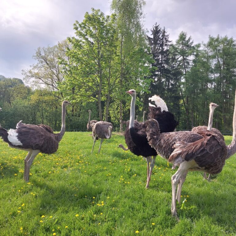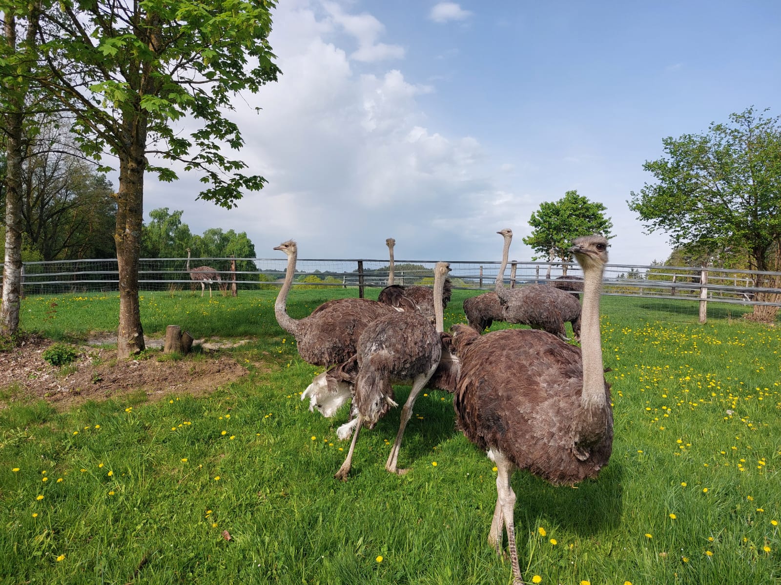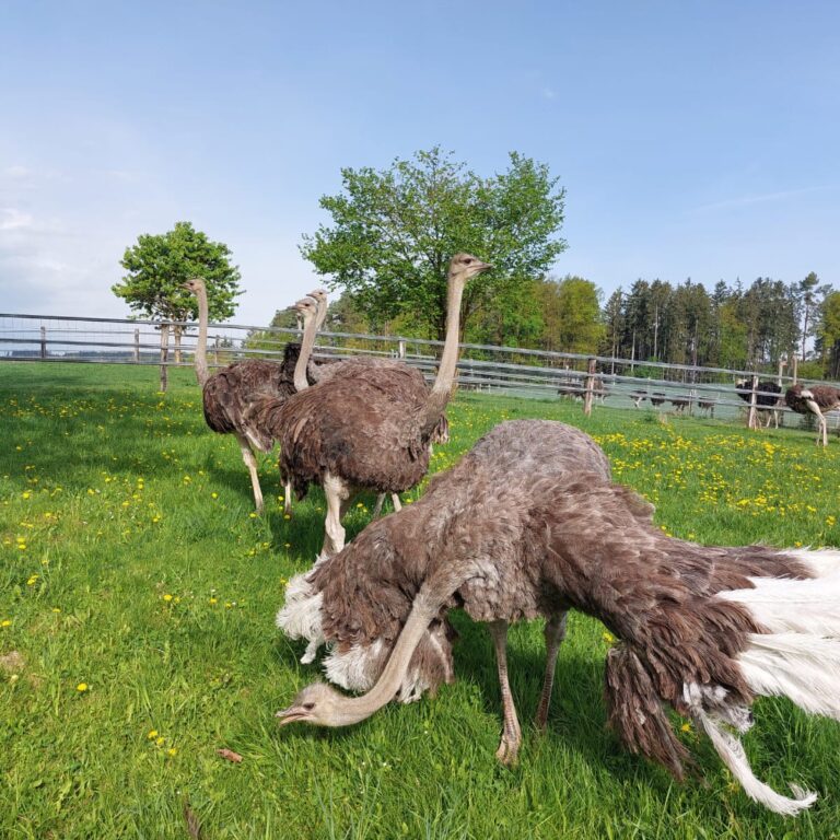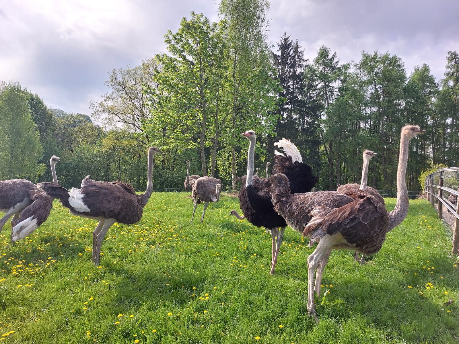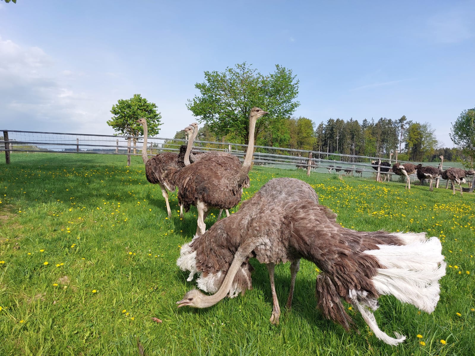 Jahrelang haben wir uns schon mit diesem Thema intensiv befasst. Nach einigen Besichtigungen anderer Straußenfarmen im In- u. Ausland sowie endlosen Genehmigungen und Seminaren, war es endlich so weit. Im Mai 2001 versuchten wir unser Glück mit einem Hahn und drei Hennen. Zur Zeit haben wir über 120 Tiere, mittlerweile sorgen 18 Zuchttiere für reichlich Nachwuchs. Es ist also kräftig was los und es gibt viel zu sehen.