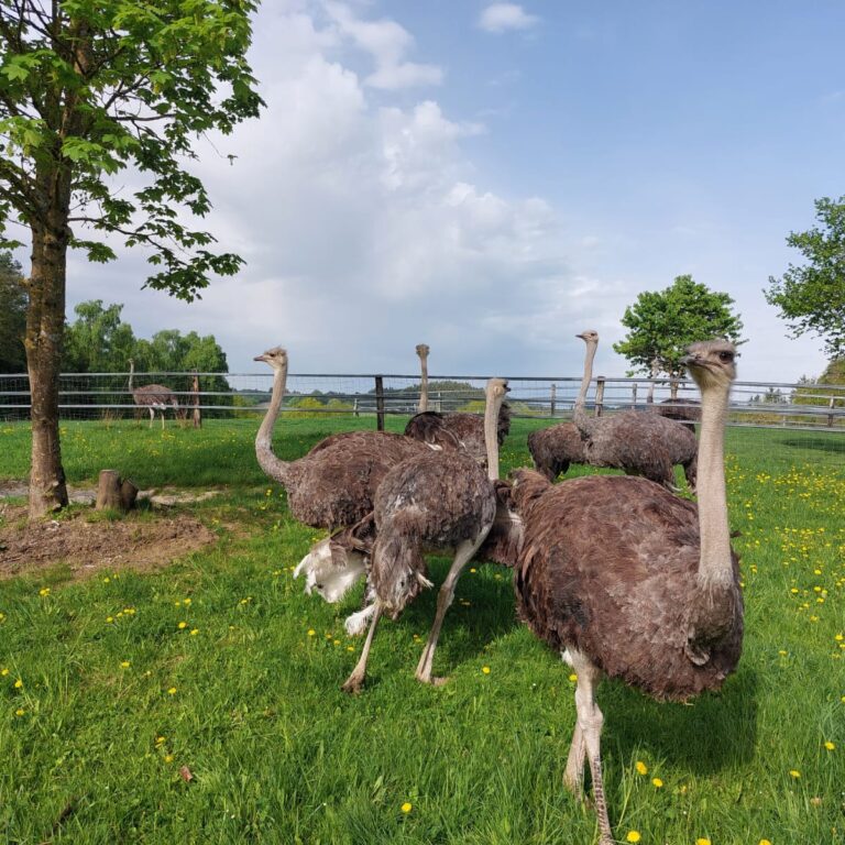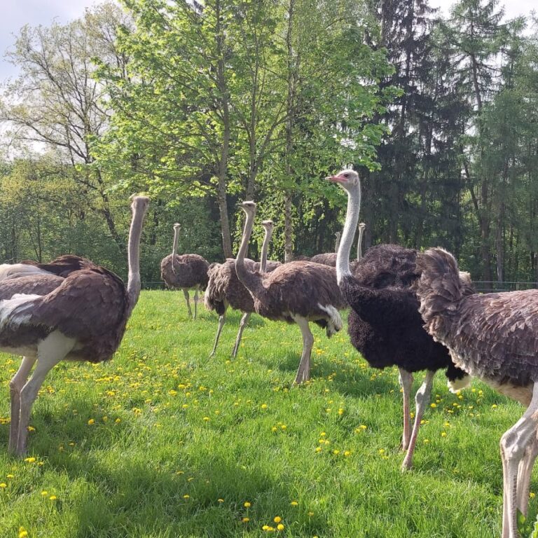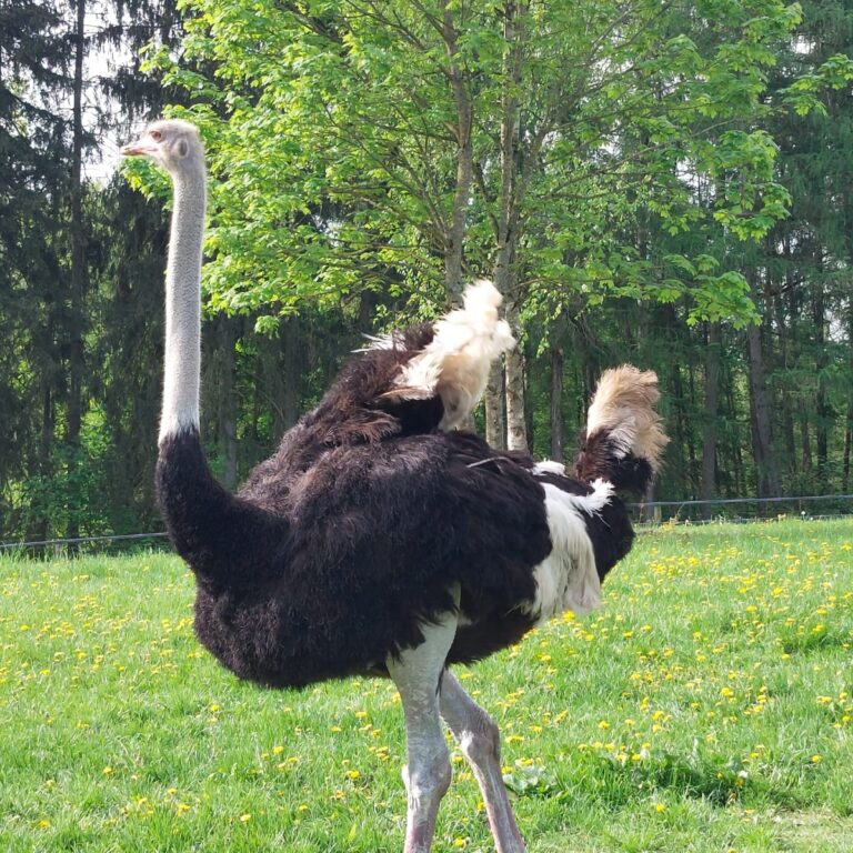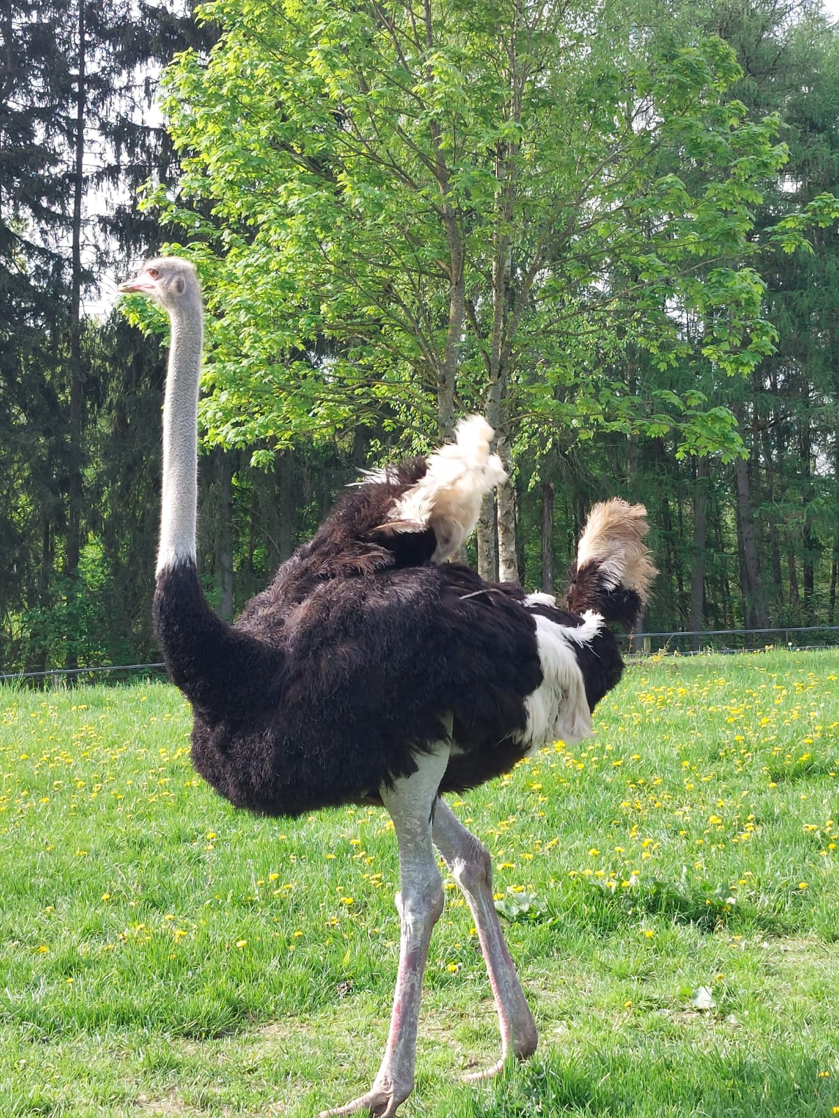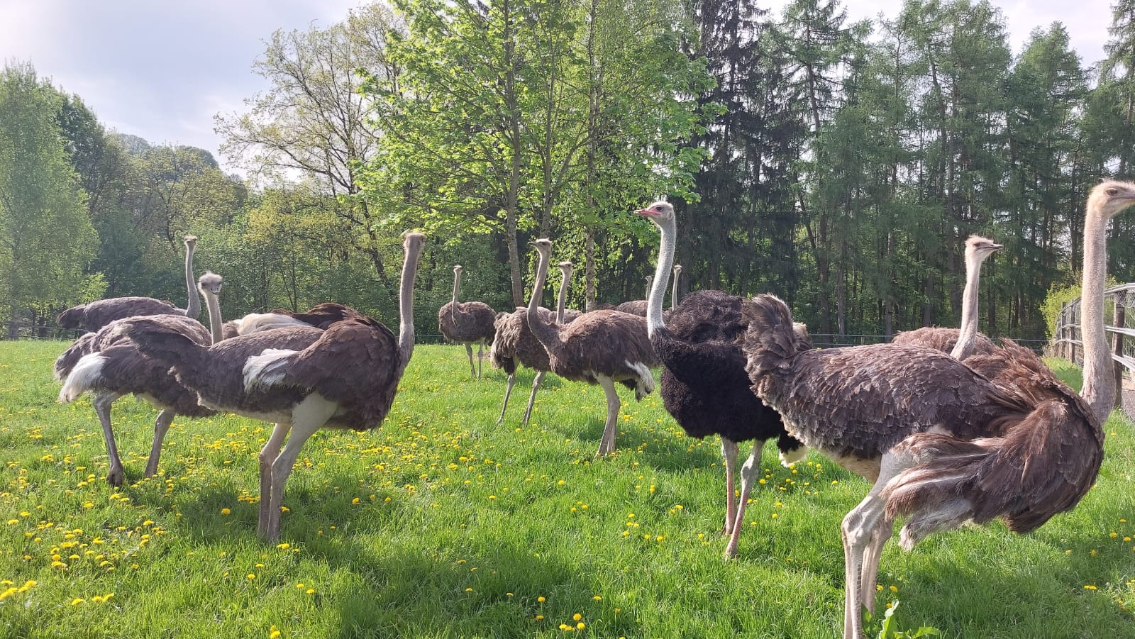 Jahrelang haben wir uns schon mit diesem Thema intensiv befasst. Nach einigen Besichtigungen anderer Straußenfarmen im In- u. Ausland sowie endlosen Genehmigungen und Seminaren, war es endlich so weit. Im Mai 2001 versuchten wir unser Glück mit einem Hahn und drei Hennen. Zur Zeit haben wir über 120 Tiere, mittlerweile sorgen 18 Zuchttiere für reichlich Nachwuchs. Es ist also kräftig was los und es gibt viel zu sehen.
