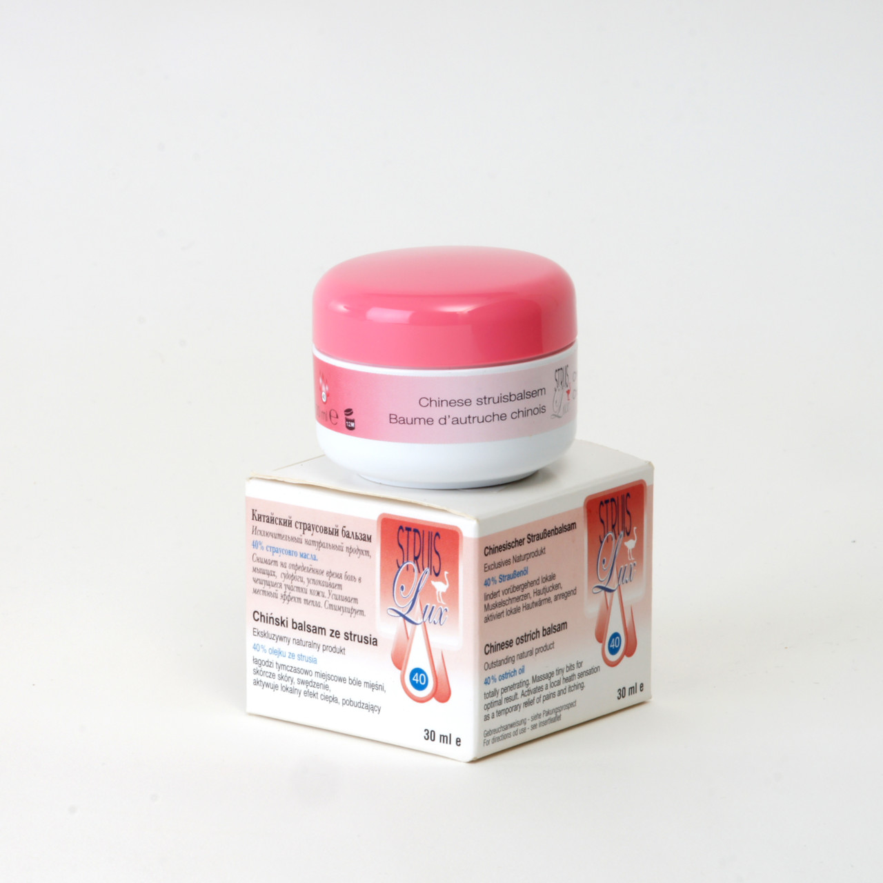 Ein völlig natürliches Produkt, das die charakteristische Wirkung von Straußenfettl verbessert. Die Wärme der Haut sorgt dafür, daß der Straußenbalsam gut in die Haut eindringt. Der Straußenbalsam mit Bienenwachs und Vitamin E pflegt bei Hornhaut, spröder Haut, spröden Lippen, Rissen, Frostbeulen sowie steifen Gelenken und Muskeln.
