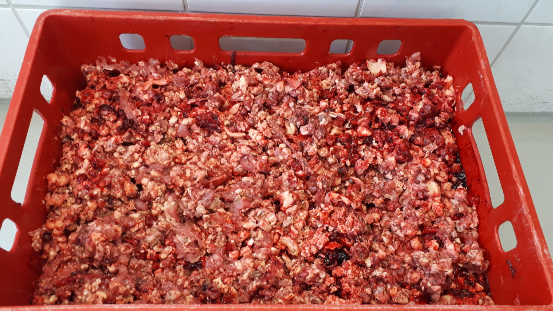 Barf vom Strauß besteht aus Fleisch-Abschnitten, Sehnen, Häute, Magen, Leber, Lunge, Blut und Straußenfett.