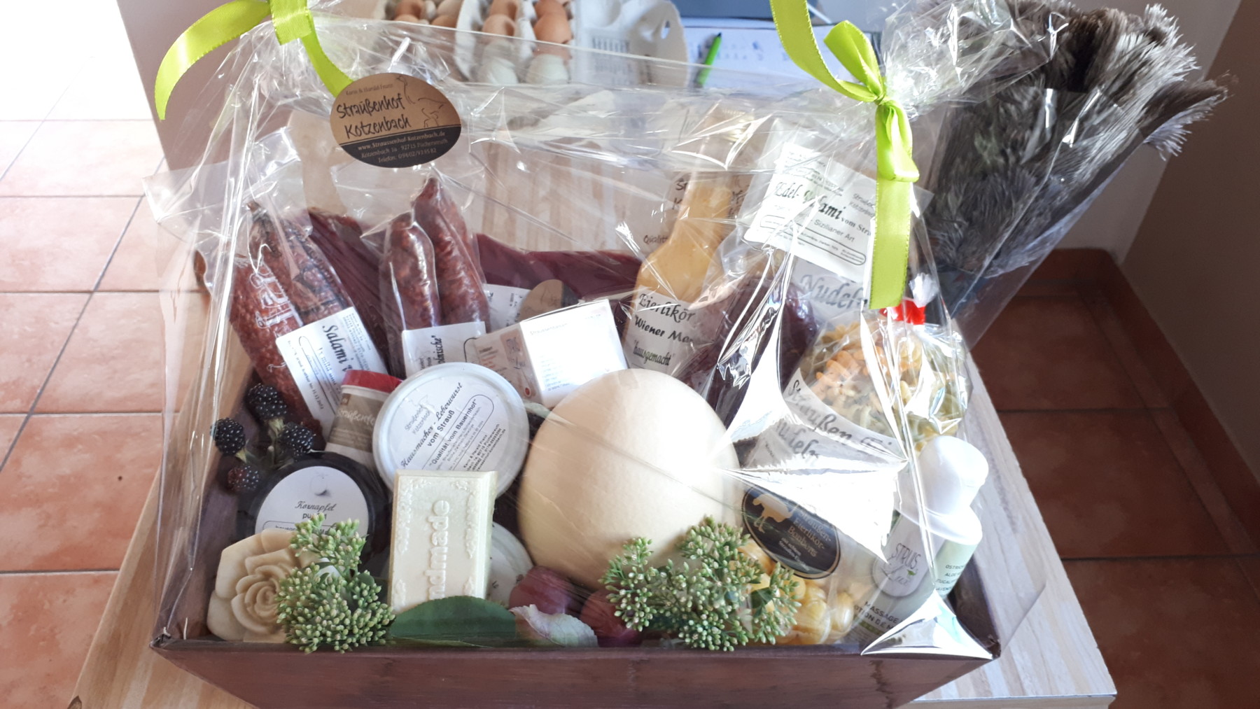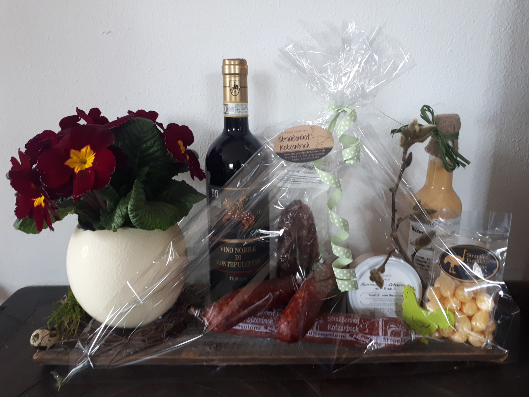 Geschenkekorb mit Spezialitäten vom Straußenhof Kotzenbach