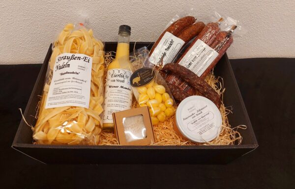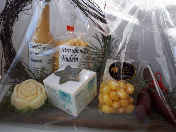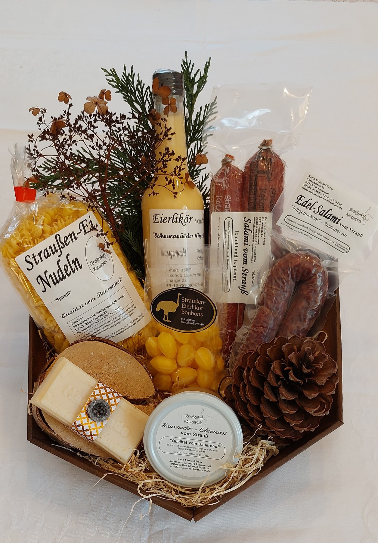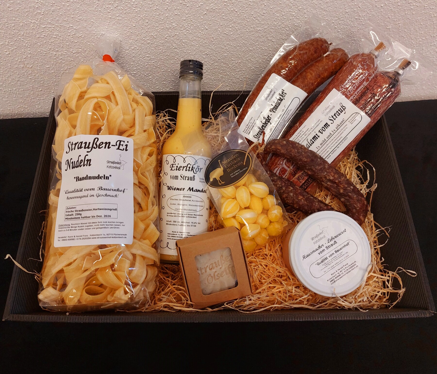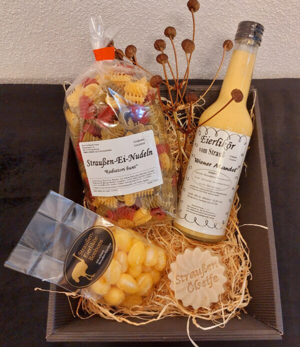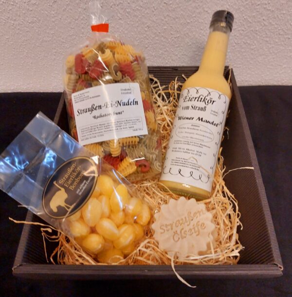 1x Eierlikör, 1x Eierlikörbonbons, 1x Straußeneiernudeln, 1x Doppelpack Salami (1x mild/1x pikant), 1x Edelsalami, 1x Leberwurst im Glas, 1x Straußenölseife handgesiedet;