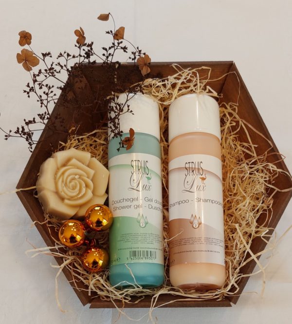 1x Duschgel mit 2% Straußenöl, 1x Straußenölseife handgesiedet; 1 Glas Honig cremig, Eierlikörbonbons