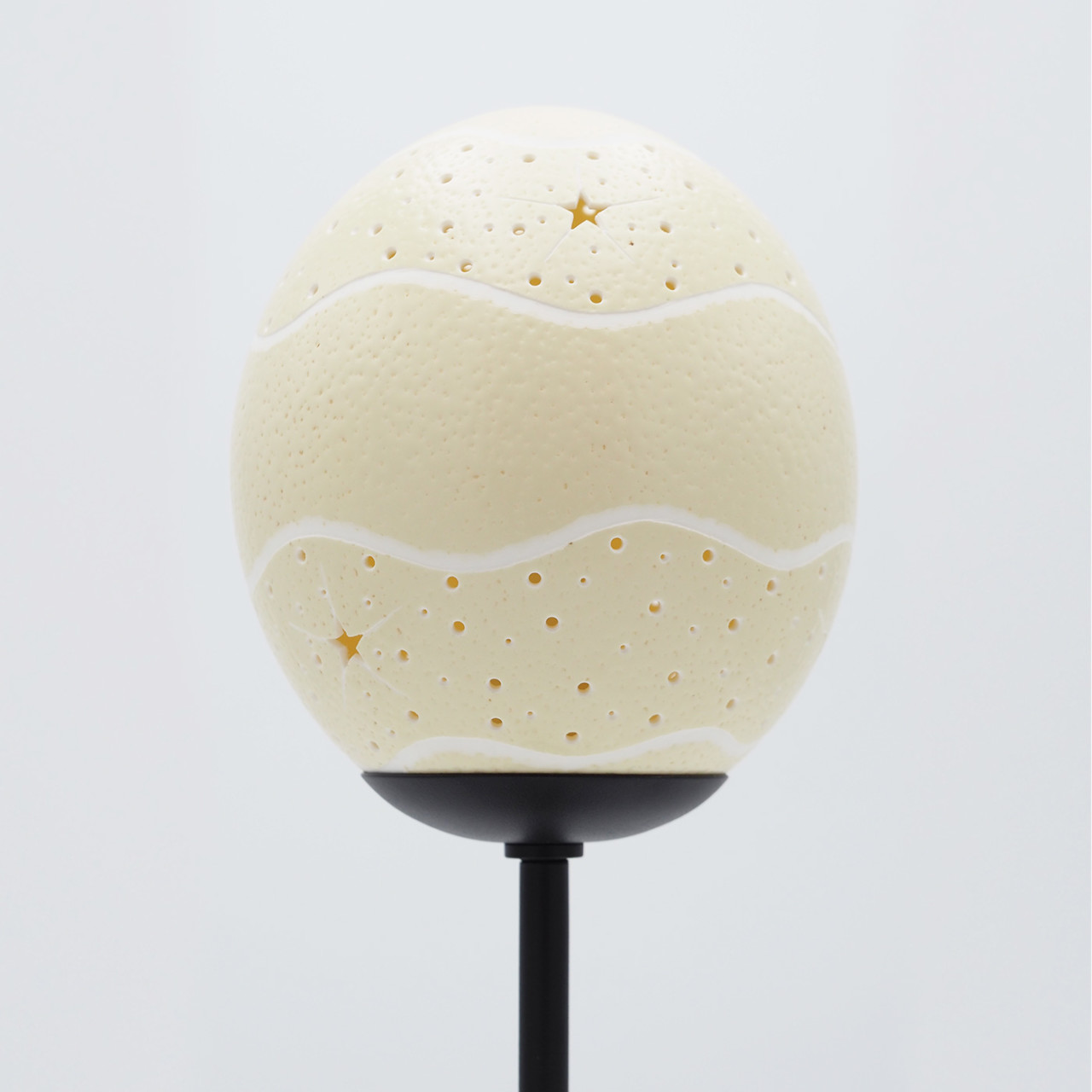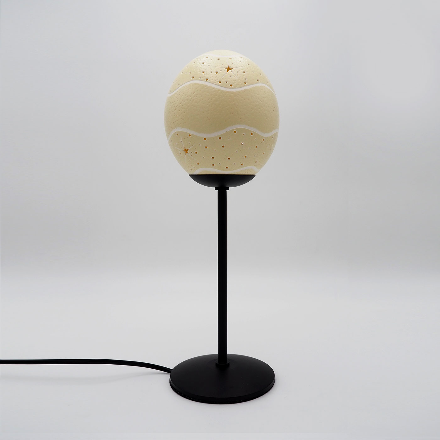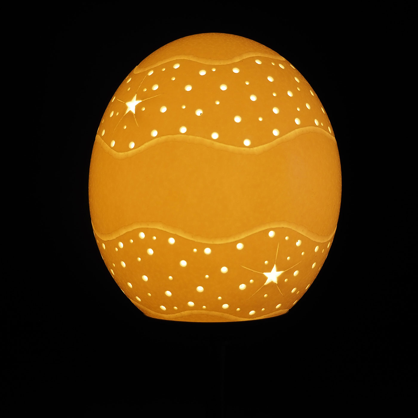 Das Straußenei ist ein Naturprodukt und genau wie beim Hühnerei variiert es in Form, Farbe und Größe. Die durchschnittliche Höhe liegt bei etwa 16 cm und einer Breite von ca. 13 cm. Es kann nur das Ei (Lampenschirm), sowie die komplette Lampe inkl. Ständer bestellt werden. Die Lampe hat eine Gesamthöhe von ca. 41 cm.