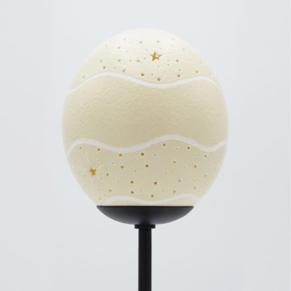 Viele kleine Löcher unten und oben am Straußenei sind der Eyecatcher an der Straußenei Lampe Sternengürtel 2. Die Löcher bilden ein schönes Geflecht an Lichtpunkten die im Raum ein schönes warmes Licht ausstrahlen.