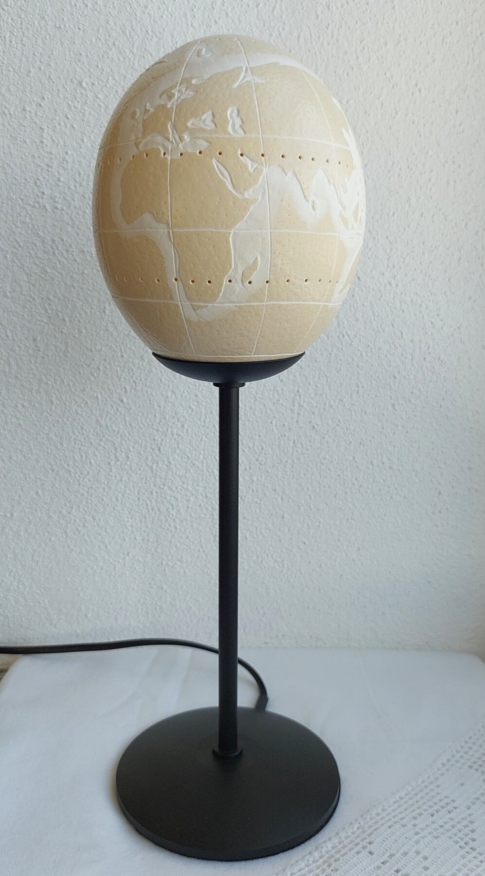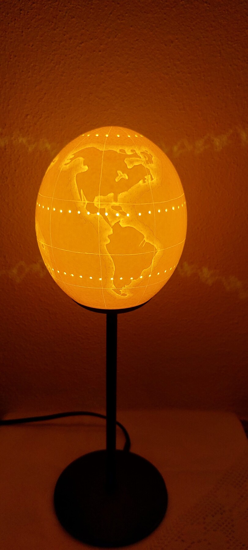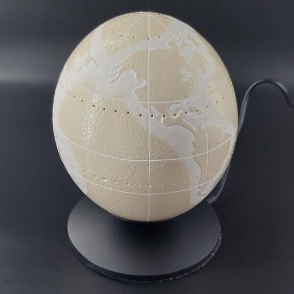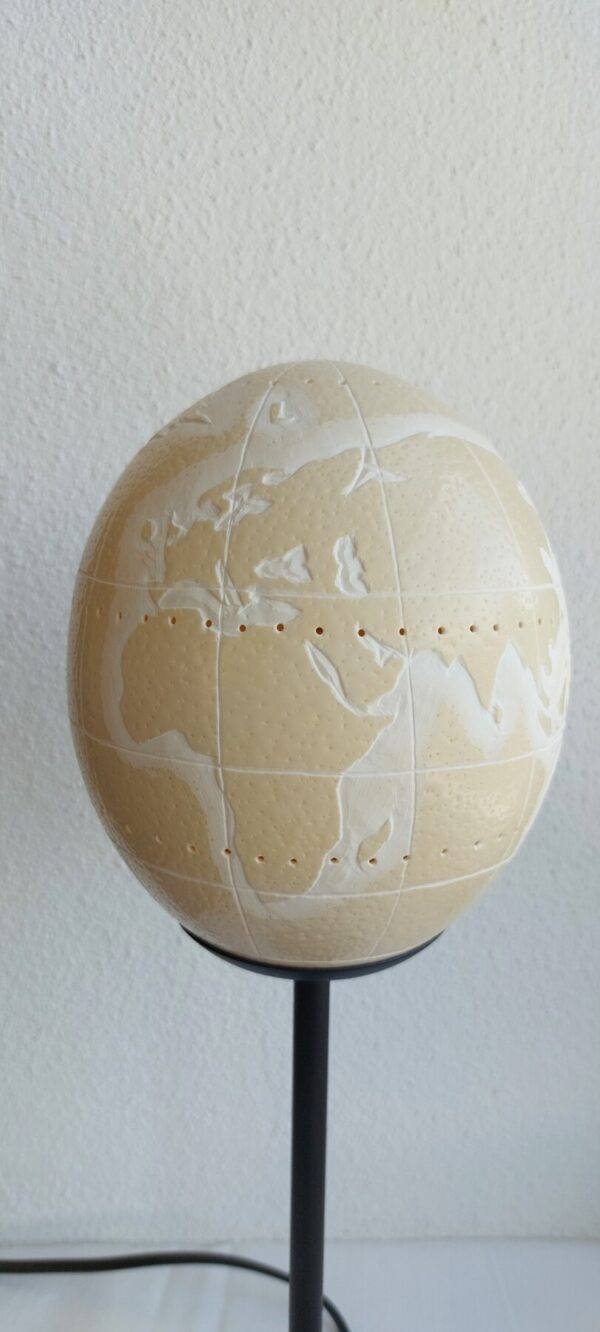 Sehr filigran und edel wirkt die Straußenei Lampe “Weltkugel”. Das Motiv der Weltkugel ist sauber ausgearbeitet und kommt im Dunkeln noch besser zur Geltung. Durch die dünneren / ausgesparten Flächen sind die Linien des Motivs sehr gut erkennbar.