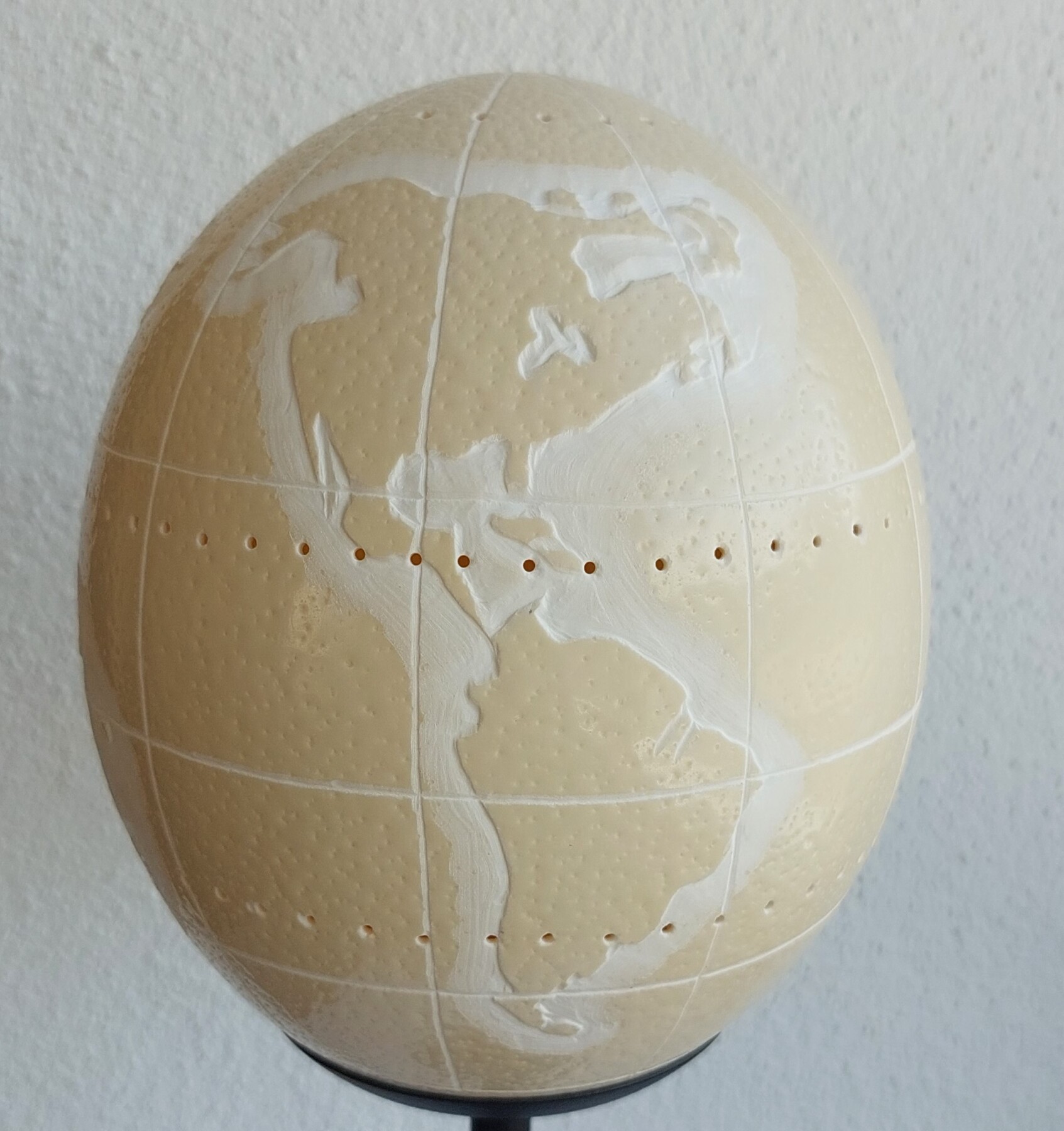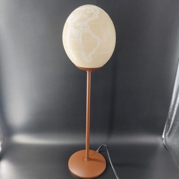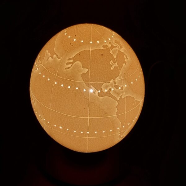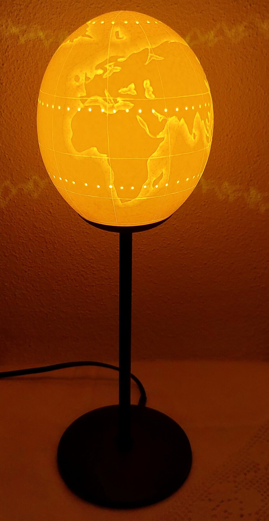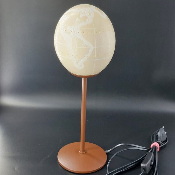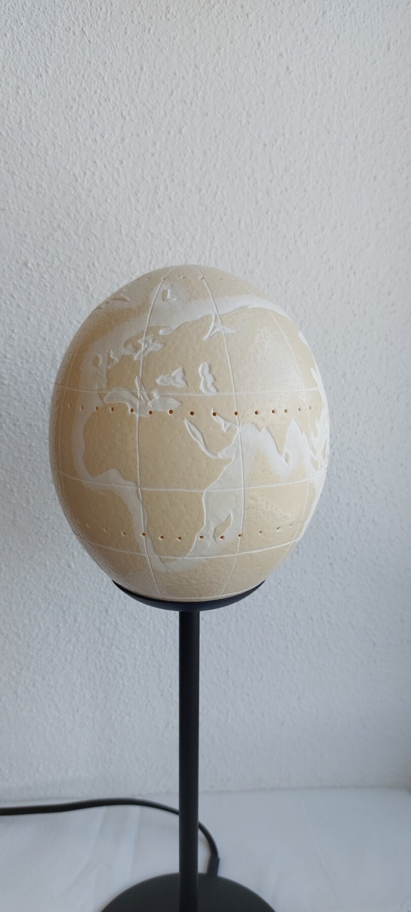 Sehr filigran und edel wirkt die Straußenei Lampe “Weltkugel”. Das Motiv der Weltkugel ist sauber ausgearbeitet und kommt im Dunkeln noch besser zur Geltung. Durch die dünneren / ausgesparten Flächen sind die Linien des Motivs sehr gut erkennbar.